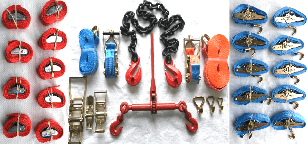 Similar to cambuckles, these are tie down straps which feature a ratchet strap as their point of securing. These ratchet straps can come in a variety of styles, including chassis hooks, delta links, rave hooks and twisted safety hooks.
